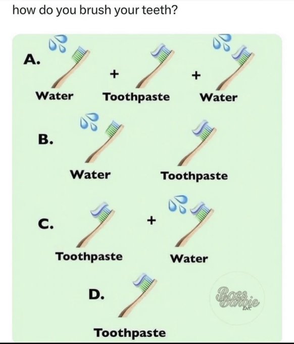 I saw this post on Twitter last night. It was a nice visual representation showing whether you wet your toothbrush or use toothpaste on a dry toothbrush while brushing your teeth. Honestly, I apply toothpaste directly to a dry toothbrush and brush my teeth that way. I think I learned this years ago, probably on a TV or radio program, although I can’t recall the exact source. They mentioned that it is not necessary to wet the toothbrush and that applying toothpaste on a dry toothbrush is just fine. Since that day, I have been using toothpaste directly on a dry toothbrush to brush my teeth.